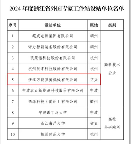 19th 12.2024 在全球化與科技創(chuàng)新的驅(qū)動(dòng)下,浙江省外國(guó)專家工作站成為吸引國(guó)際高端人才、推動(dòng)企業(yè)創(chuàng)新發(fā)展的重要平臺(tái)。自2020年《浙江省外國(guó)專家工作站管理辦法》實(shí)施以來,紹興市在吸引外籍專家方面取得了顯著成績(jī)。截至目前,紹興市已有6家單位獲批為省級(jí)外國(guó)專家工作站,位居全省前列。 2024年,浙江萬能彈簧機(jī)械有限公司榮...